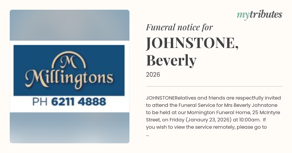 Relatives and friends are respectfully invited to attend the Funeral Service for Mrs Beverly Johnstone to be held at our Mornington Funeral Home, 25 McIntyre Street, on Friday (Janaury 23, 2026) at 10:00am. If you wish to view the service remotely, please go to millingtons.com.au/tributes/ click on Beverly's profile, and then select the livestream link.