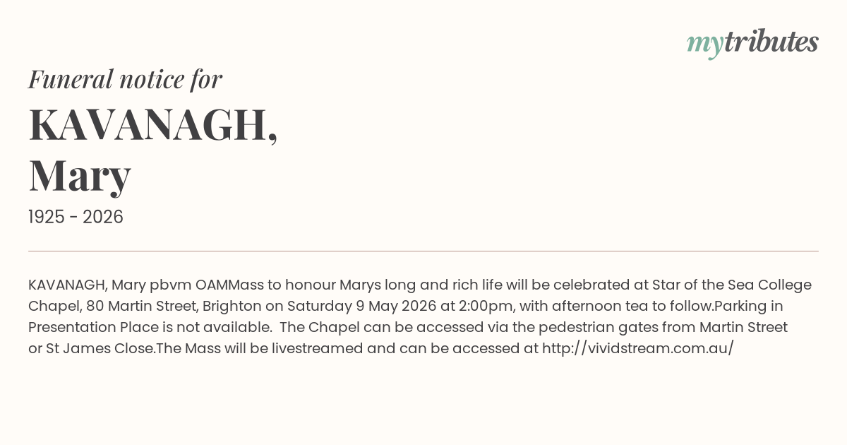 Mass to honour Mary’s long and rich life will be celebrated at Star of the Sea College Chapel, 80 Martin Street, Brighton on Saturday 9 May 2026 at 2:00pm, with afternoon tea to follow.