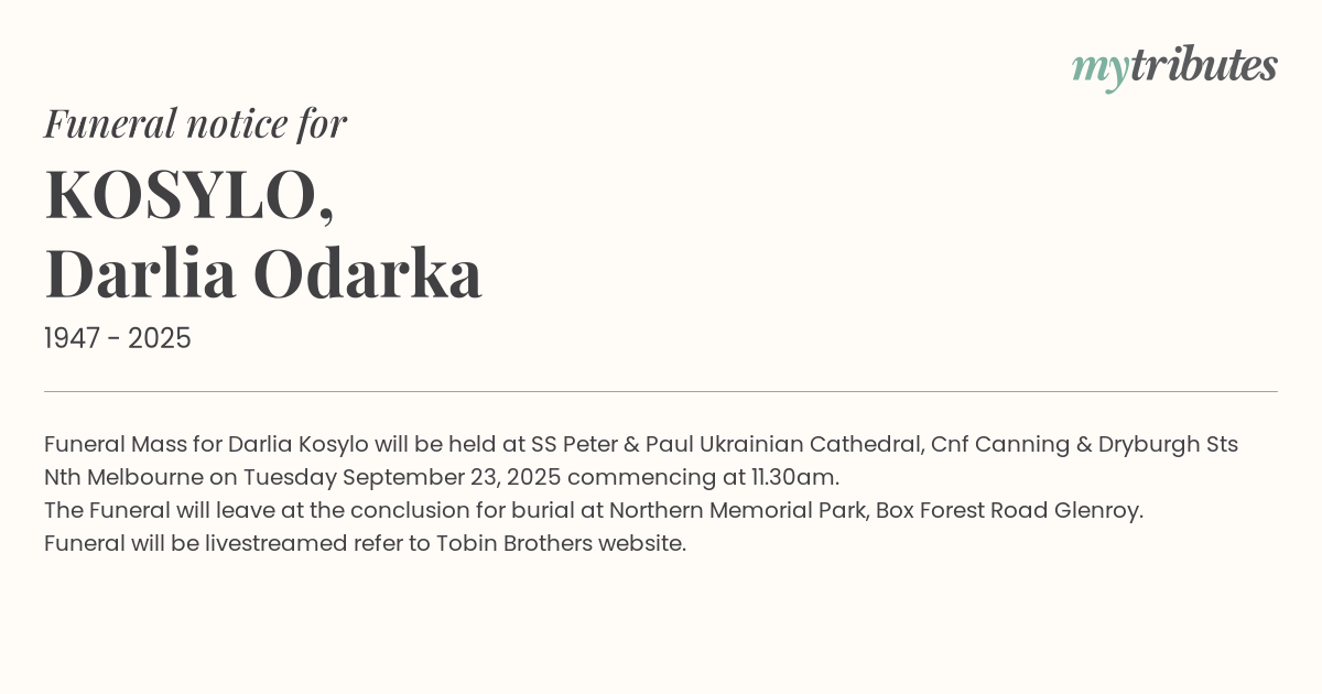 17°CFuneral Mass for Darlia Kosylo will be held at SS Peter & Paul Ukrainian Cathedral, Cnf Canning & Dryburgh Sts Nth Melbourne on Tuesday September 23, 2025 commencing at 11.30am.