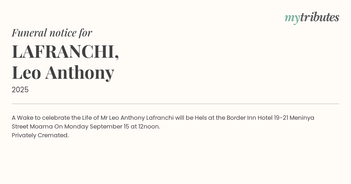 17°CA Wake to celebrate the Life of Mr Leo Anthony Lafranchi will be Hels at the Border Inn Hotel 19-21 Meninya Street Moama On Monday September 15 at 12noon.