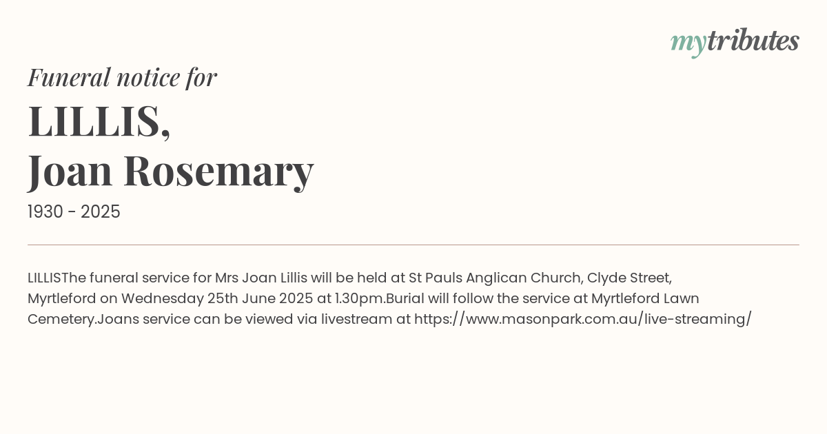 The funeral service for Mrs Joan Lillis will be held at St Paul’s Anglican Church, Clyde Street, Myrtleford on Wednesday 25th June 2025 at 1.30pm.