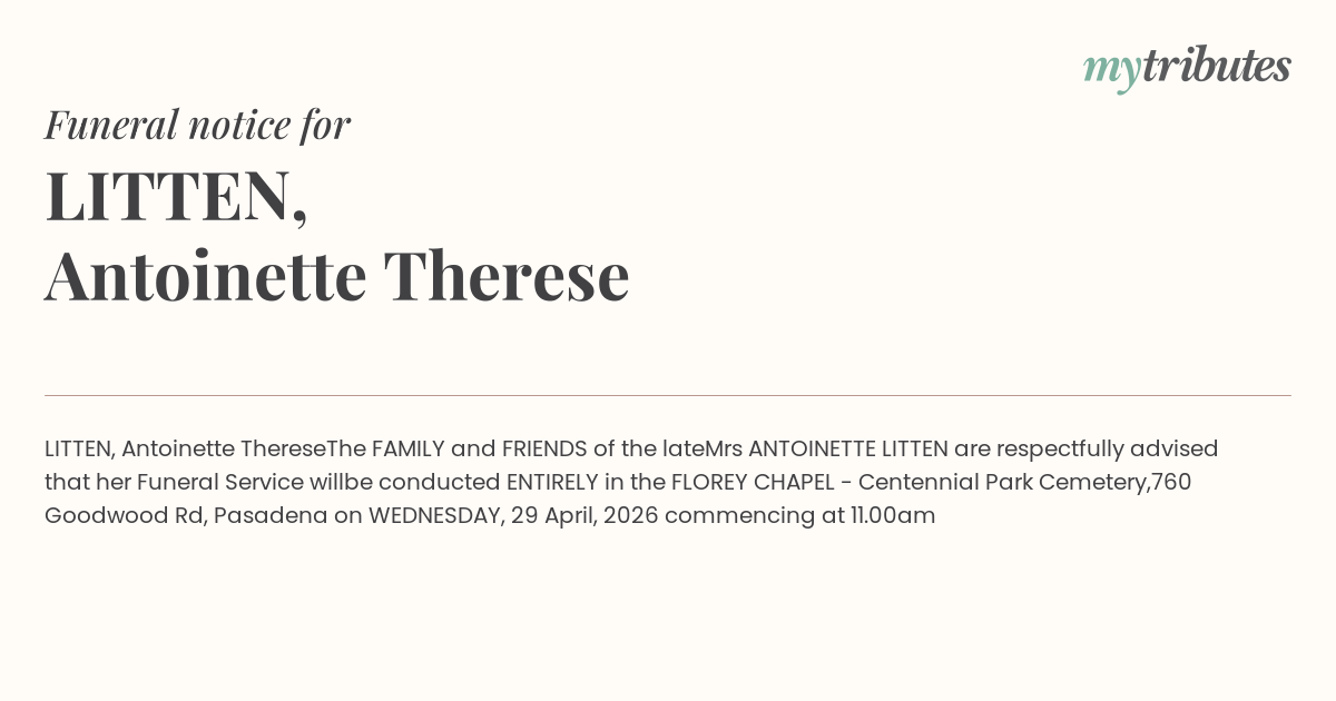 Mrs ANTOINETTE LITTEN are respectfully advised that her Funeral Service will