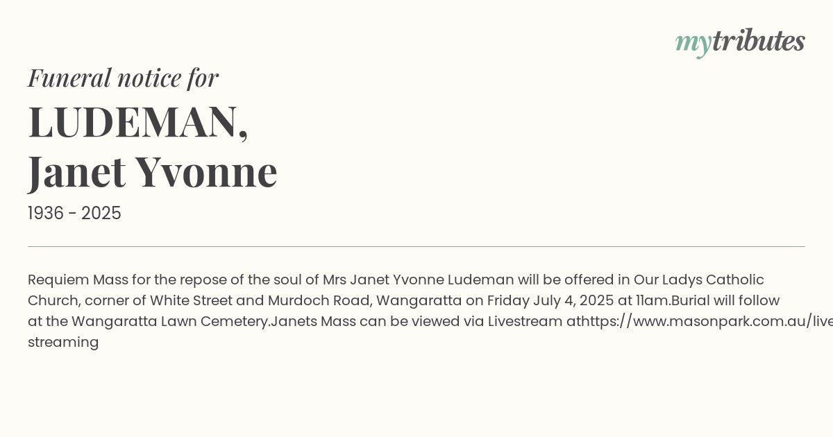 17°CRequiem Mass for the repose of the soul of Mrs Janet Yvonne Ludeman will be offered in Our Lady’s Catholic Church, corner of White Street and Murdoch Road, Wangaratta on Friday July 4, 2025 at 11am.