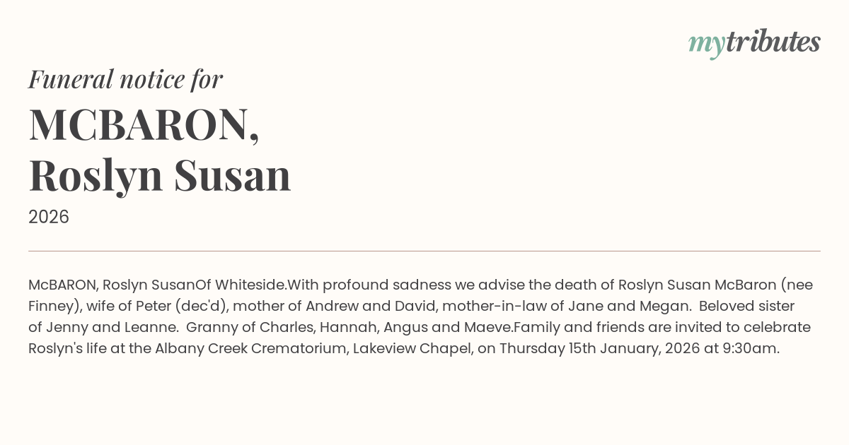 With profound sadness we advise the death of Roslyn Susan McBaron (nee Finney), wife of Peter (dec'd), mother of Andrew and David, mother-in-law of Jane and Megan. Beloved sister of Jenny and Leanne. Granny of Charles, Hannah, Angus and Maeve.
