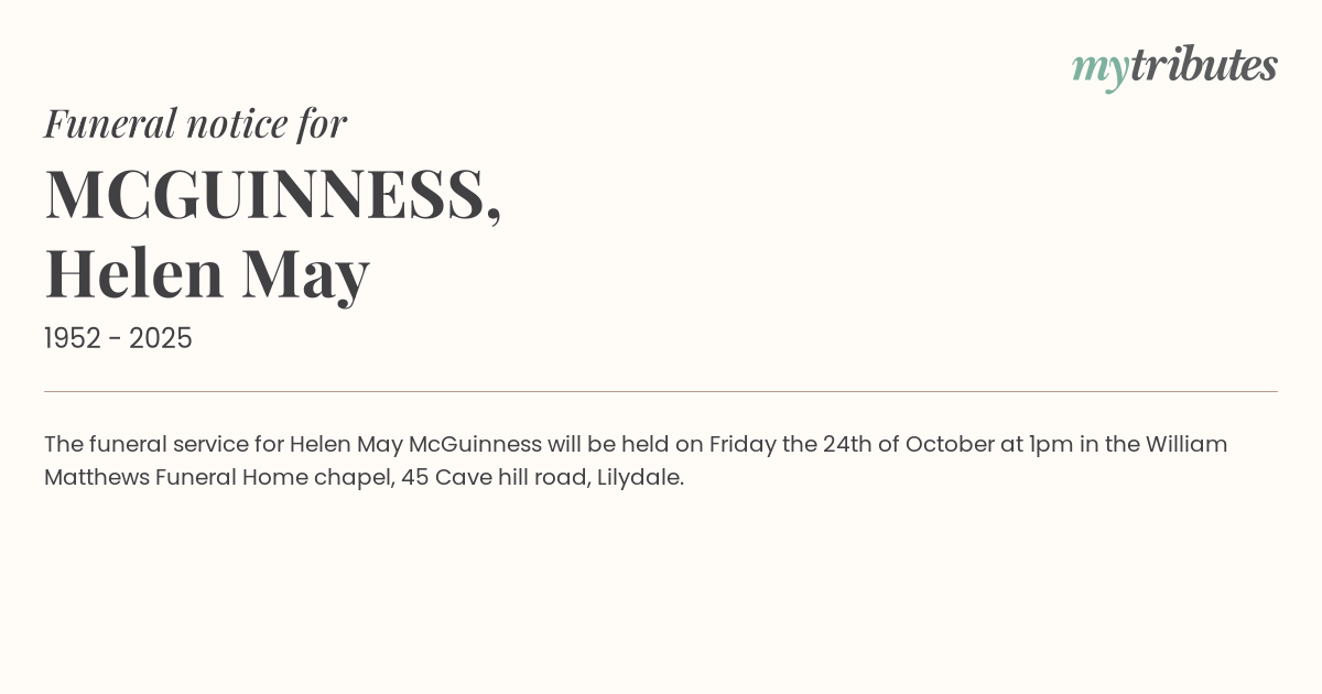 17°CThe funeral service for Helen May McGuinness will be held on Friday the 24th of October at 1pm in the William Matthews Funeral Home chapel, 45 Cave hill road, Lilydale.