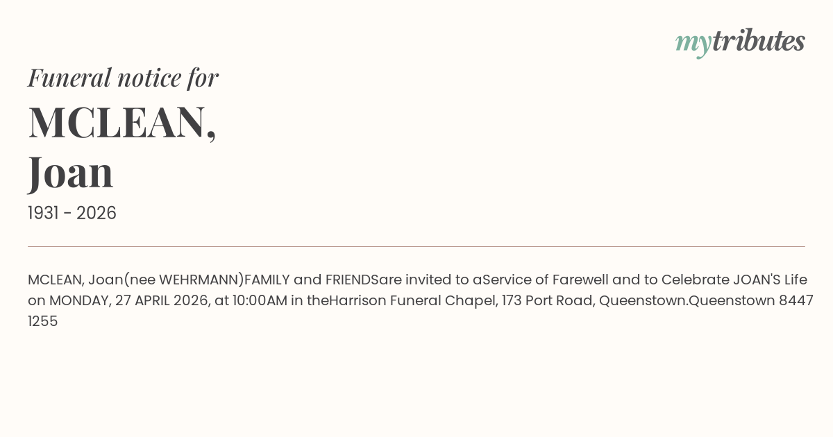 Service of Farewell and to Celebrate JOAN'S Life on MONDAY, 27 APRIL 2026, at 10:00AM in the