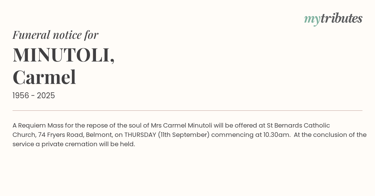 17°CA Requiem Mass for the repose of the soul of Mrs Carmel Minutoli will be offered at St Bernards Catholic Church, 74 Fryers Road, Belmont, on THURSDAY (11th September) commencing at 10.30am. At the conclusion of the service a private cremation will be held.
