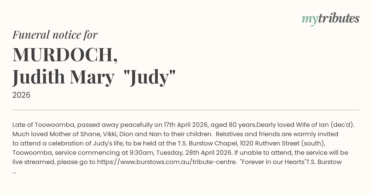 Relatives and friends are warmly invited to attend a celebration of Judy's life, to be held at the T.S. Burstow Chapel, 1020 Ruthven Street (south), Toowoomba, service commencing at 9:30am, Tuesday, 28th April 2026.