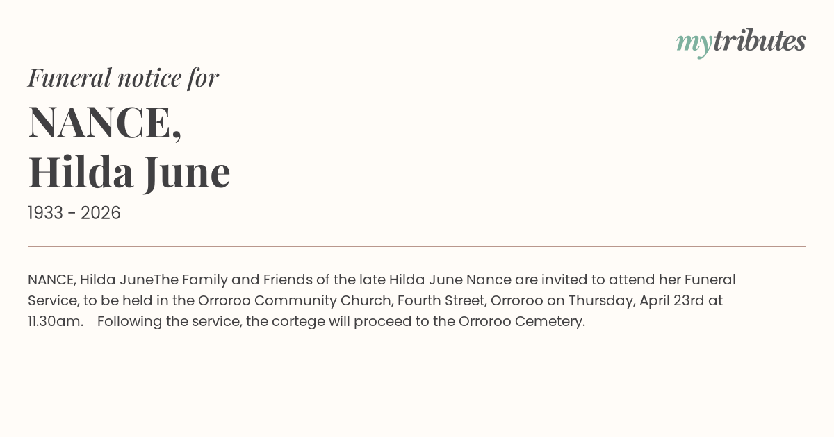 The Family and Friends of the late Hilda June Nance are invited to attend her Funeral Service, to be held in the Orroroo Community Church, Fourth Street, Orroroo on Thursday, April 23rd at 11.30am.