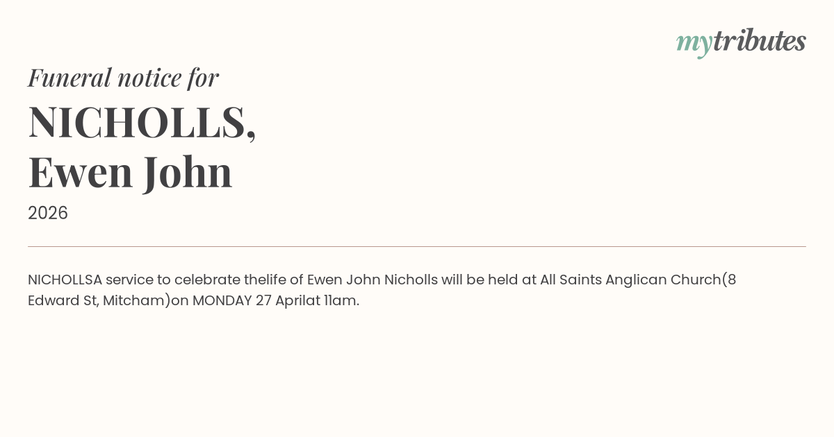life of Ewen John Nicholls will be held at All Saints Anglican Church