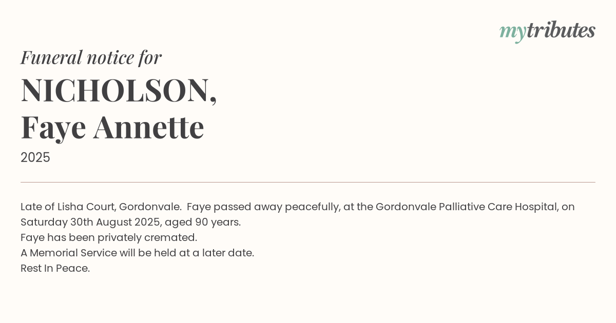 17°CLate of Lisha Court, Gordonvale. Faye passed away peacefully, at the Gordonvale Palliative Care Hospital, on Saturday 30th August 2025, aged 90 years.
