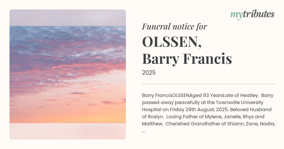 Late of Heatley. Barry passed away peacefully at the Townsville University Hospital on Friday 29th August, 2025. Beloved Husband of Roslyn. Loving Father of Mylene, Janelle, Rhys and Matthew. Cherished Grandfather of Shiann, Zane, Nadia, Indi, Monique and Jude, Great Grandfather of Brodie, Lexi, Dusty, Sienna, Sophie, Talon and Colbie.