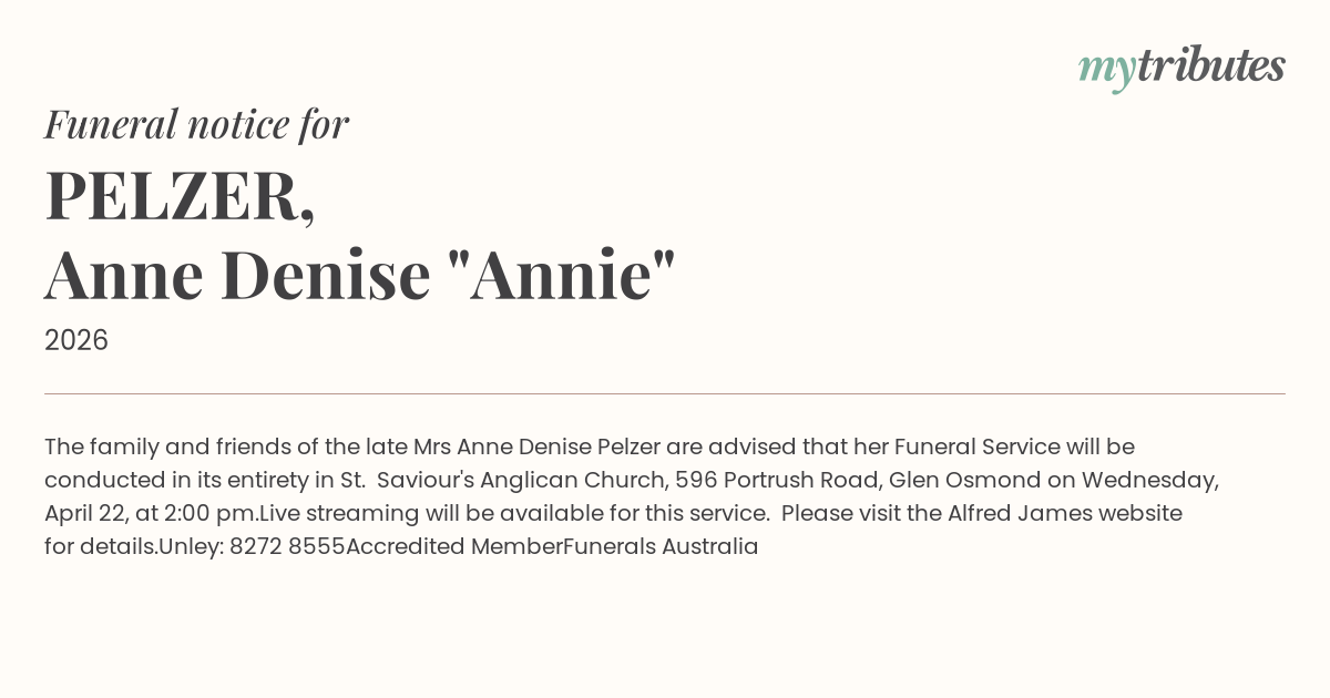 17°CThe family and friends of the late Mrs Anne Denise Pelzer are advised that her Funeral Service will be conducted in its entirety in St. Saviour's Anglican Church, 596 Portrush Road, Glen Osmond on Wednesday, April 22, at 2:00 pm.
