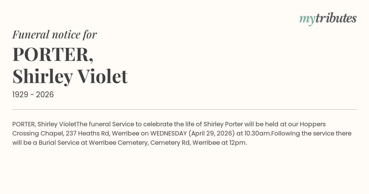 The funeral Service to celebrate the life of Shirley Porter will be held at our Hoppers Crossing Chapel, 237 Heaths Rd, Werribee on WEDNESDAY (April 29, 2026) at 10.30am.