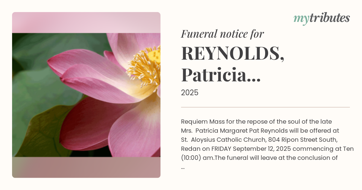 17°CRequiem Mass for the repose of the soul of the late Mrs. Patricia Margaret ‘Pat’ Reynolds will be offered at St. Aloysius Catholic Church, 804 Ripon Street South, Redan on FRIDAY September 12, 2025 commencing at Ten (10:00) am.