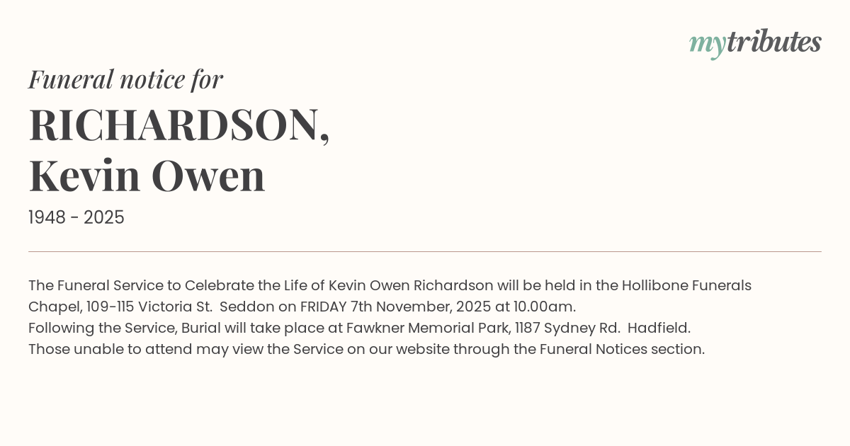 17°CThe Funeral Service to Celebrate the Life of Kevin Owen Richardson will be held in the Hollibone Funerals Chapel, 109-115 Victoria St. Seddon on FRIDAY 7th November, 2025 at 10.00am.