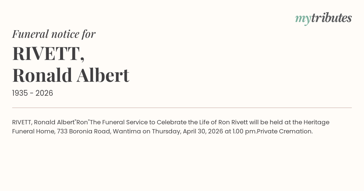 The Funeral Service to Celebrate the Life of Ron Rivett will be held at the Heritage Funeral Home, 733 Boronia Road, Wantirna on Thursday, April 30, 2026 at 1.00 pm.