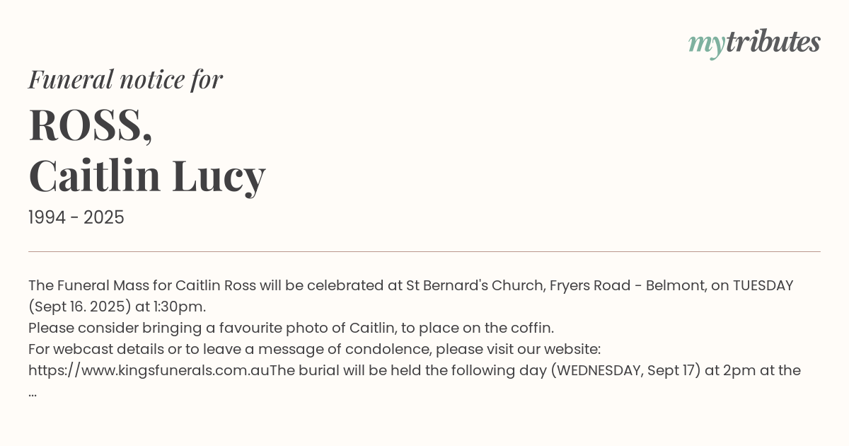 17°CThe Funeral Mass for Caitlin Ross will be celebrated at St Bernard's Church, Fryers Road - Belmont, on TUESDAY (Sept 16. 2025) at 1:30pm.