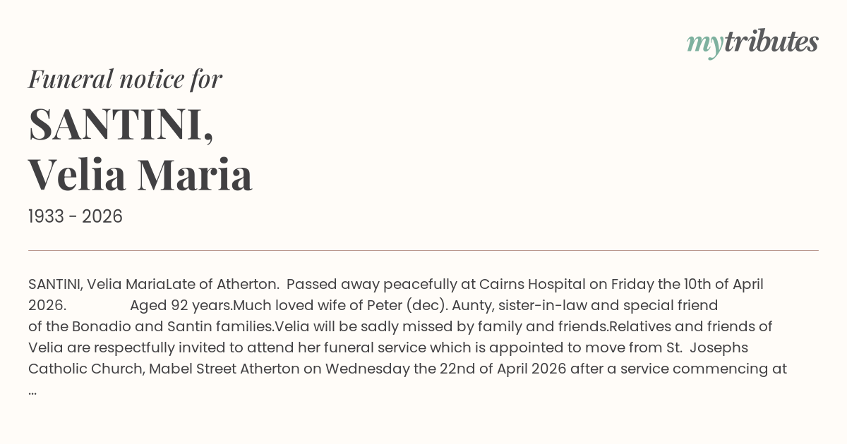 Relatives and friends of Velia are respectfully invited to attend her funeral service which is appointed to move from St. Joseph’s Catholic Church, Mabel Street Atherton on Wednesday the 22nd of April 2026 after a service commencing at 11.30am for interment in the Atherton new cemetery.