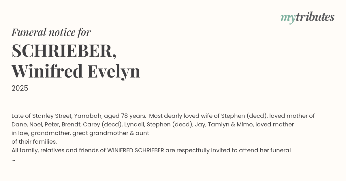 All family, relatives and friends of WINIFRED SCHRIEBER are respectfully invited to attend her funeral service, which will be held on FRIDAY MORNING 12th September 2025, commencing at 10.00am at St Alban’s Anglican Church, Yarrabah, followed by interment at the Yarrabah