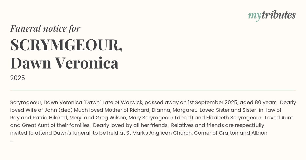 17°CScrymgeour, Dawn Veronica "Dawn" Late of Warwick, passed away on 1st September 2025, aged 80 years. Dearly loved Wife of John (dec) Much loved Mother of Richard, Dianna, Margaret. Loved Sister and Sister-in-law of Ray and Patria Hildred, Meryl and Greg Wilson, Mary Scrymgeour (dec'd) and Elizabeth Scrymgeour. Loved Aunt and Great Aunt of their families. Dearly loved by all her friends. Relatives and friends are respectfully invited to attend Dawn's funeral, to be held at St Mark's Anglican Church, Corner of Grafton and Albion Streets, Warwick, service commencing at 12:30pm, Monday, 15th September 2025, followed by interment at the Warwick Lawn Cemetery, Lancaster Street, Warwick. "With John in God's Care"