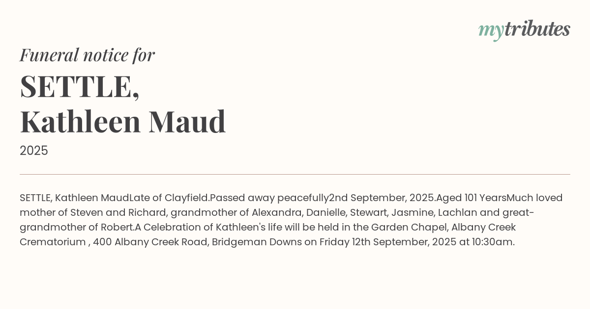 A Celebration of Kathleen's life will be held in the Garden Chapel, Albany Creek Crematorium , 400 Albany Creek Road, Bridgeman Downs on Friday 12th September, 2025