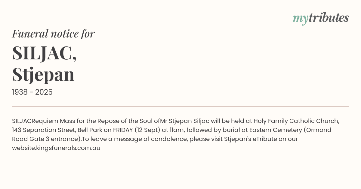 Mr Stjepan Siljac will be held at Holy Family Catholic Church, 143 Separation Street,