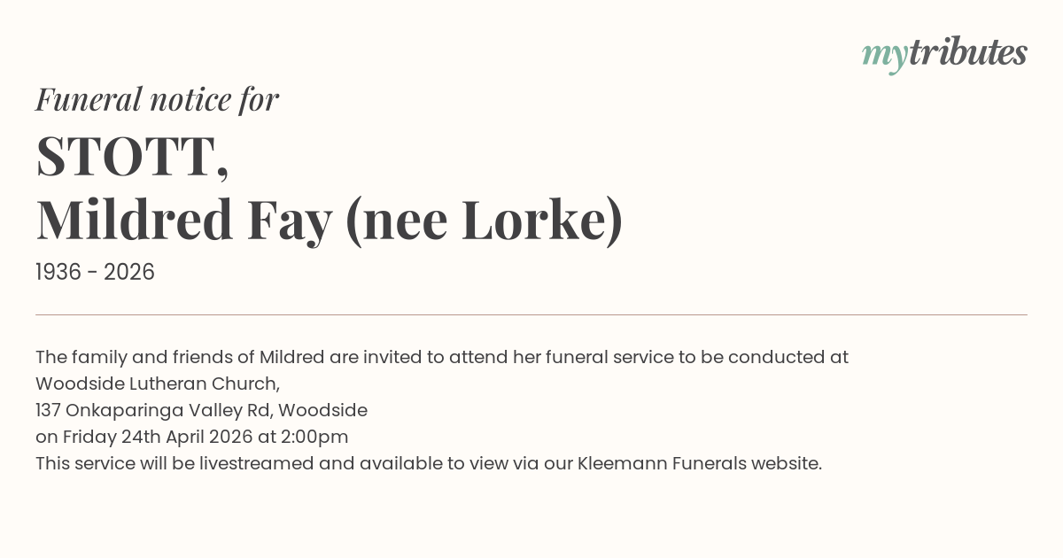 17°CThe family and friends of Mildred are invited to attend her funeral service to be conducted at