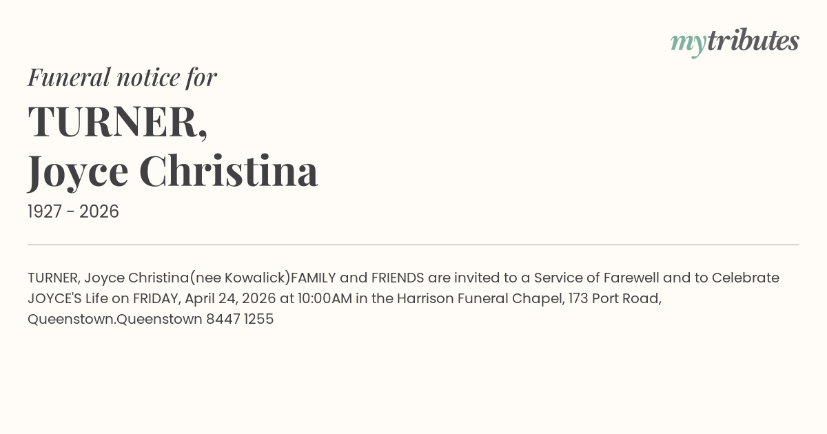 FAMILY and FRIENDS are invited to a Service of Farewell and to Celebrate JOYCE'S Life on FRIDAY, April 24, 2026 at 10:00AM in the Harrison Funeral Chapel, 173 Port Road, Queenstown.