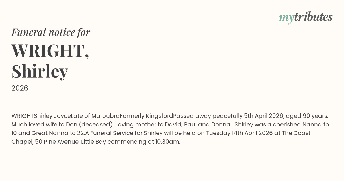A Funeral Service for Shirley will be held on Tuesday 14th April 2026 at The Coast Chapel, 50 Pine Avenue, Little Bay commencing at 10.30am.
